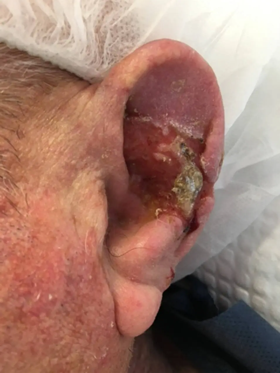 - Le carcinome épidermoïde se présente sous la forme d’une lésion crouteuse, ulcérée qui évolue assez rapidement. Il est potentiellement agressif et doit être retiré chirurgicalement le plus précocement possible. Les risques de récidive sont importants et le risque de métastase est réel. Des alternatives à la chirurgie sont possibles (radiothérapie, chimiothérapie) lorsque la tumeur est inextirpable ou que l’état du patient contre-indique une intervention chirurgicale. Les décisions thérapeutiques prises doivent faire l’objet d’un consensus en réunion de concertation pluridisciplinaires.